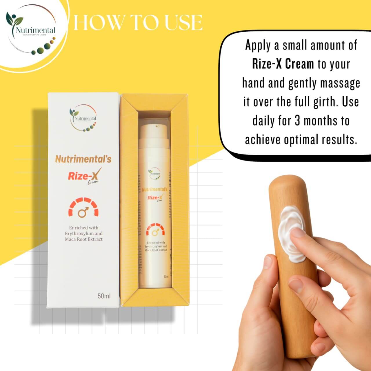 – Directions for Use: Apply a small amount of Rize-X Cream to the Organ and massage gently until absorbed with regular uses twice a day, you will find the difference in three months. Early results start coming within fortnight. It is to be applied all over from top to bottom